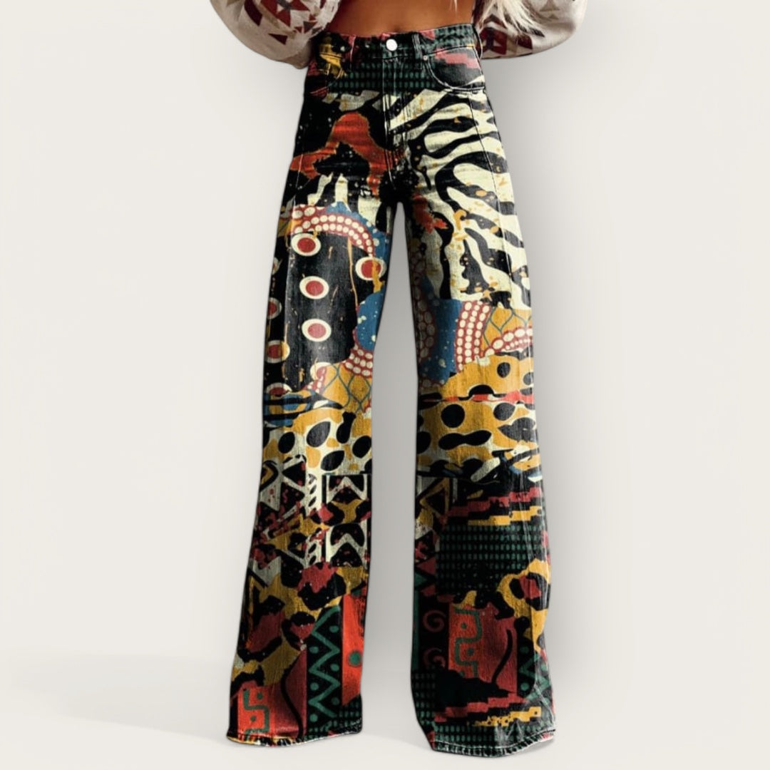 Discover the Tarsilla Wide Leg Trousers with an Eclectic Artistic Design—a fashion statement that naturally draws attention. These trousers combine a unique artistic touch with a wide leg silhouette, allowing you to express your bold and distinctive style while staying on trend.